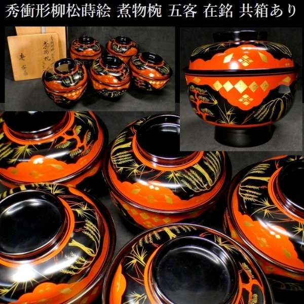 【 恵 #0468 】 華やかな秀衝形柳松蒔絵 煮物椀 五客 在銘 共箱あり 検:椀/漆器/漆芸品