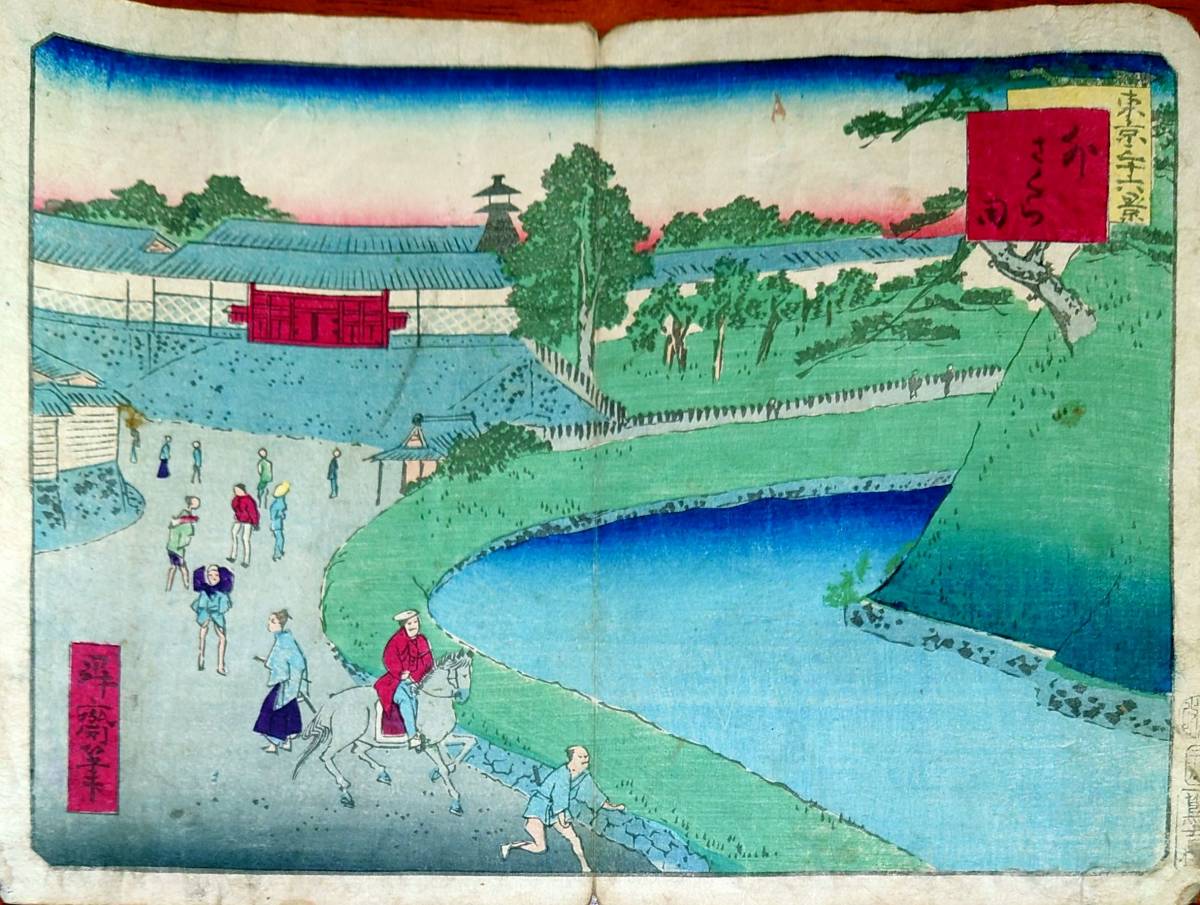- f23021513〇昇斎一景 東京三十六景 外さくら田 外桜田門 明治4年 蔦吉版 折本 戯画風タッチ オリジナル版画〇和本古書古文書