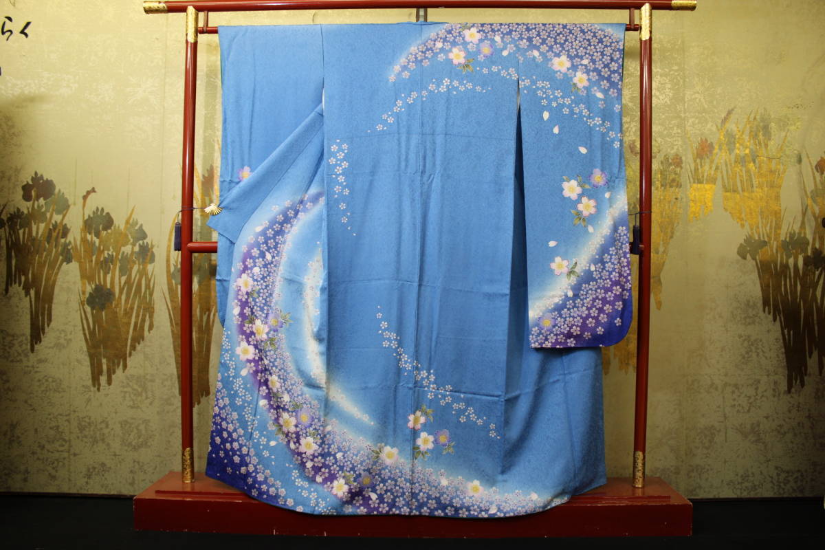 - きもの今昔4823 振り袖 ブルー色地グラデーション 桜吹雪の柄 きものの「やまと」誂え品 身丈155cm