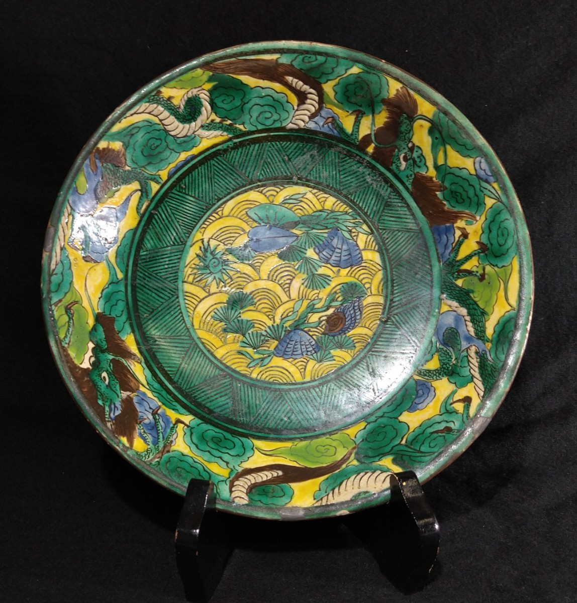 - 中村秋塘 初代 青手 波文 雲龍に海中図 23cm 中皿 九谷焼 銀継ぎ有 師:竹内吟秋 bpn-23a2758-Q108
