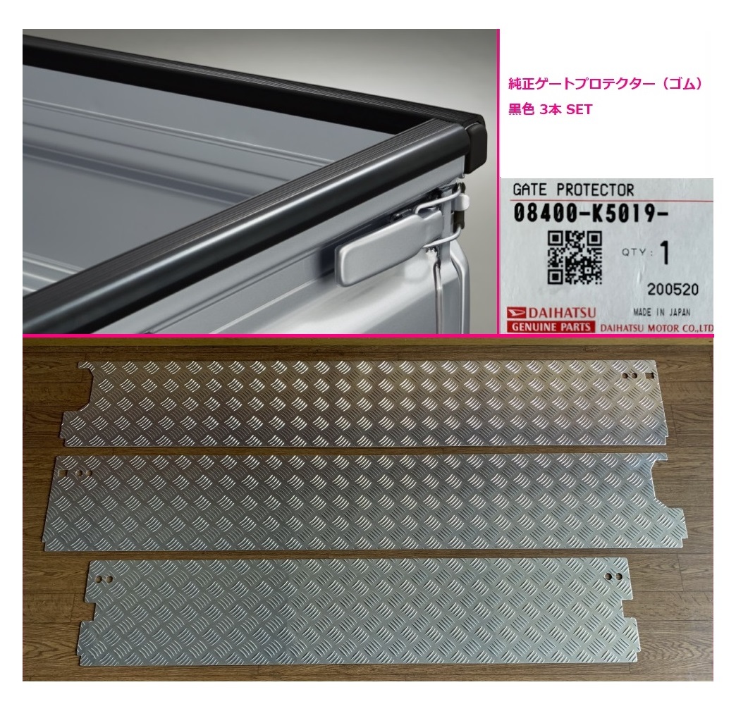 - ★軽トラ サンバーグランドキャブ S500J 荷台ゲートインナーアルミ縞板パネル 3枚+純正ゲートプロテクター(黒ゴム)SET