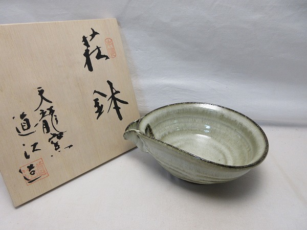 > I04327 【 ほぼ未使用 茶道具 道江造 萩焼 窯変片口鉢 天龍窯 共箱 】 検) 作家物 煎茶道具 菓子入れ 盛鉢 盛器 茶事 茶会 おもてなし ⅱ