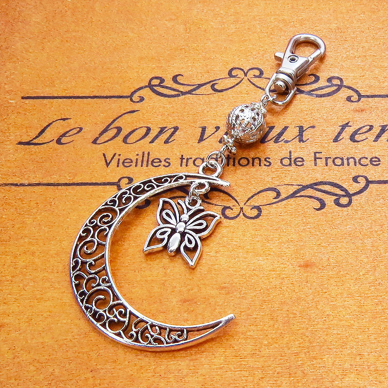 - アンティークシルバー 透かし模様のある三日月と蝶のモチーフのキーホルダー バタフライ バッグチャーム 金具変更可