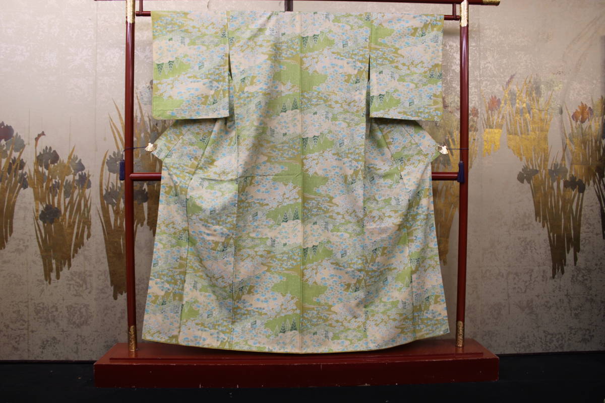 > きもの今昔5026 ウールのきもの 染ウール八掛付きバチ衿身頃単衣仕立 クリーム地色緑系庭園樹木風景柄 身丈151㎝