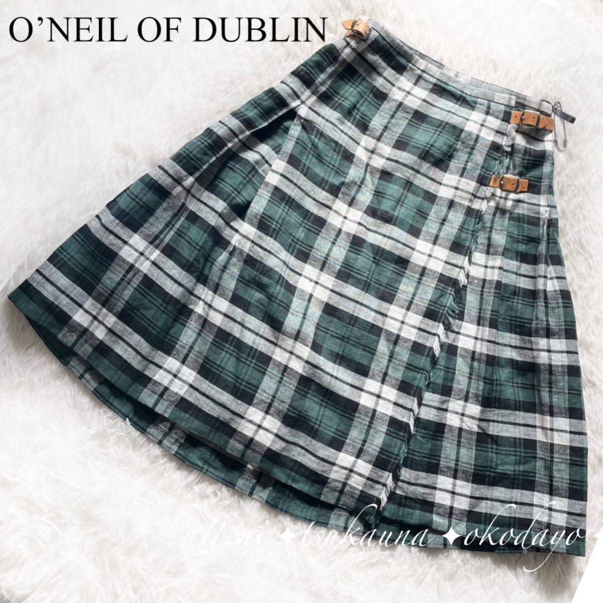 > O’NEILOFDUBLIN オニールオブダブリン リネン 麻 チェック柄 総柄 膝丈 ひざ丈 フレア Aライン スカート 巻きスカート ラップスカート