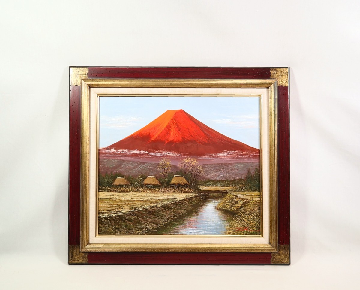 > 真作 川島孝之 油彩「忍野赤富士」画 F10 三重県出身 東然会所属 澄んだ空と鮮やか朱に染まる山肌の富嶽、麓の茅葺き屋根の古民家集落 7459
