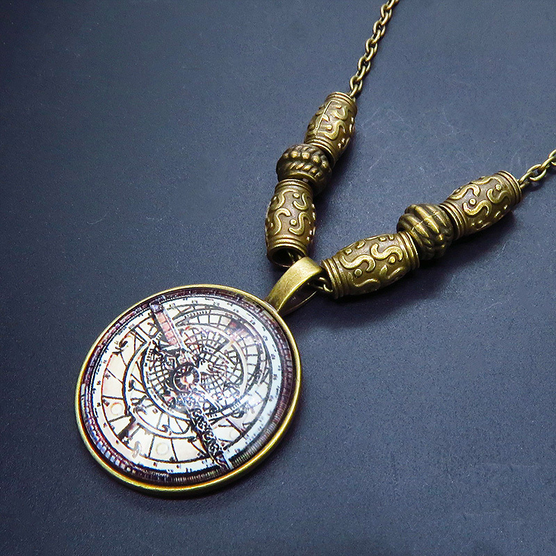 - アンティークゴールド 羅針盤・方位磁針のイラストのペンダント・ネックレス 重力針 スチームパンク風 ガラス