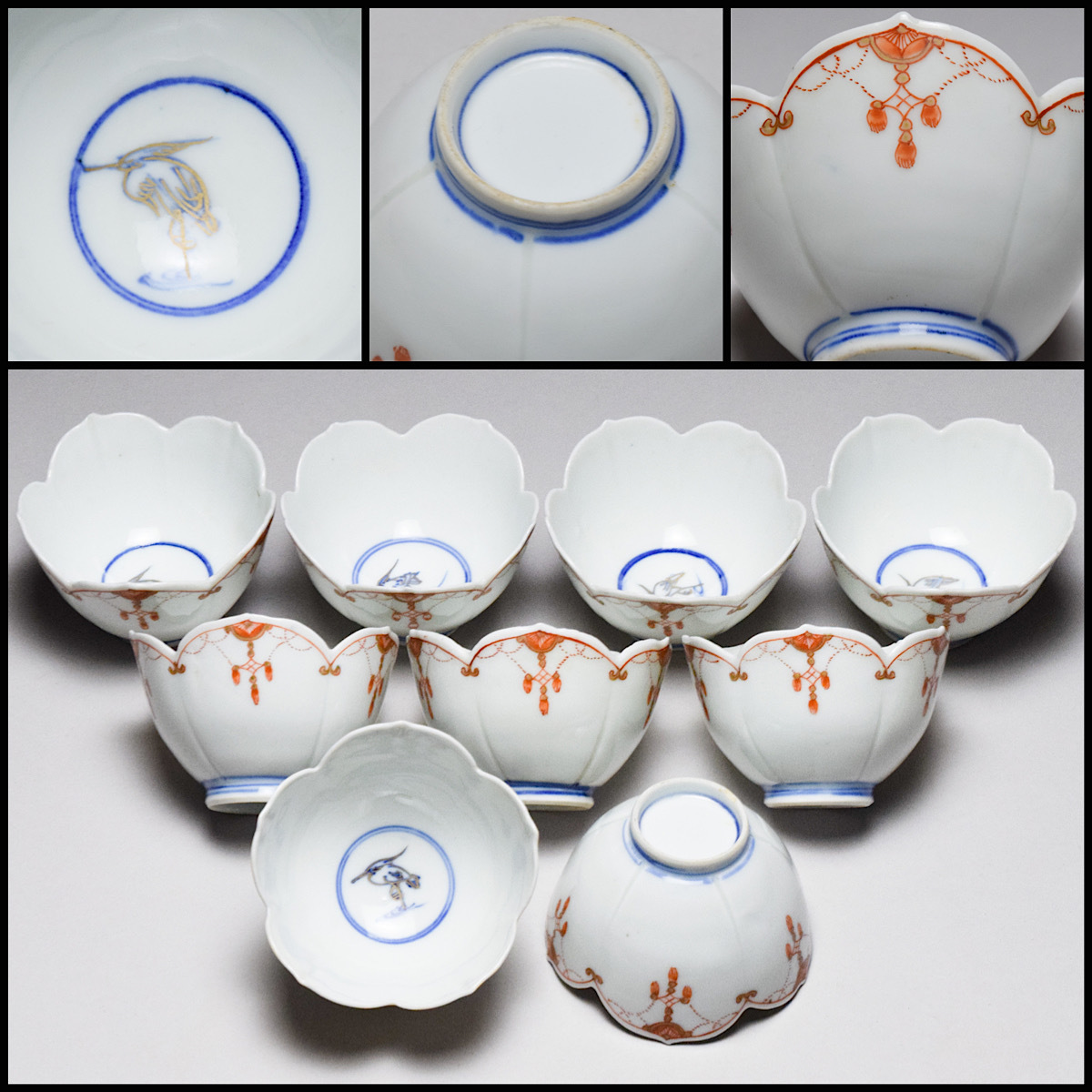 > 【八八八】九谷焼 花弁形 花口 見込 染付 鷺絵 赤絵 瓔珞文 向付 9客 D ◆箱なし 懐石道具 和食器 料理屋 料亭 珍味入 【c-282】