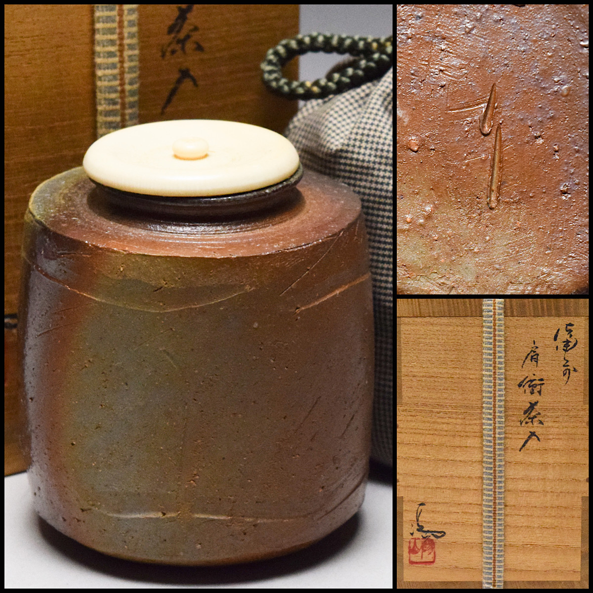 - 【八八八】伊勢崎満 備前焼 肩衝 茶入 ◆共箱 共布 仕覆付 茶道具 茶器 備前 【d-033】