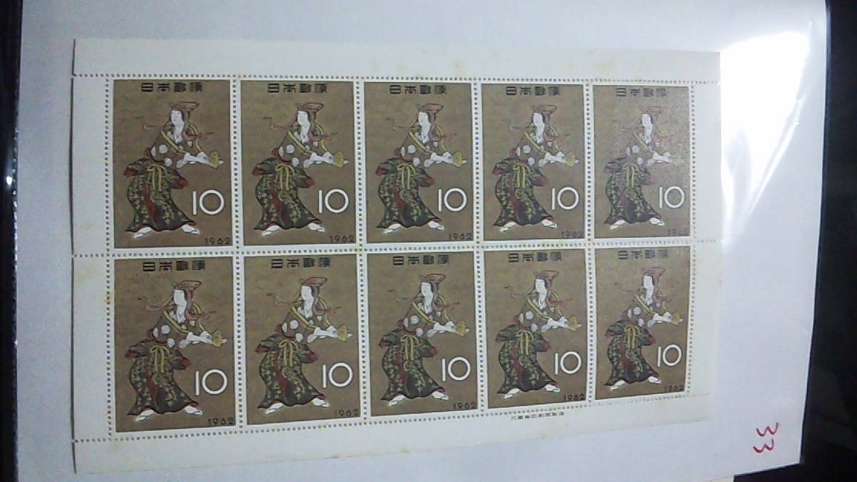 > .未使用切手 切手趣味週間 1962年 花下遊楽(狩野長信) 10円10枚シート シミあり