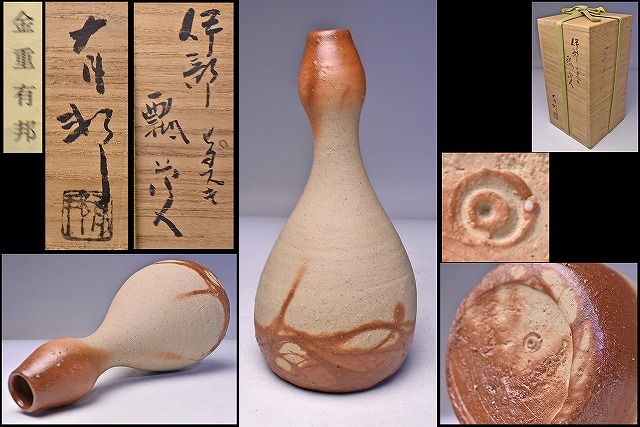 > 金重有邦 ★ 伊部ヒダスキ 瓢 花入 ★ 共箱 栞 ★ 父 : 金重素山 / 叔父 : 人間国宝 金重陶陽 ★ 緋襷 華道具 ★ 検 金重まこと 金重道明