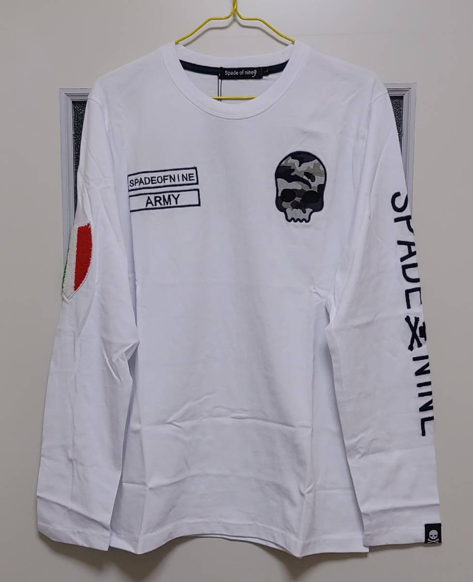 > 2018 クール! SPADE OF NINE Tシャツ 丸首 長袖 白『迷彩スカル』前後左袖刺繍 骸骨 L・身幅約53cm※未試着品/未使用品/商品タグ付き