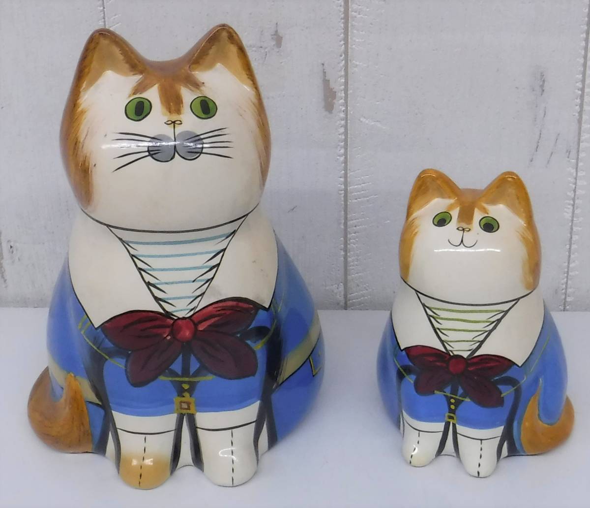 - 昭和レトロ 当時物 *レトロ置物 *ネコ ペア 2点まとめ *土人形 *マリンルック *オブジェ インテリア*レア アンティーク*10.5cm 15cm