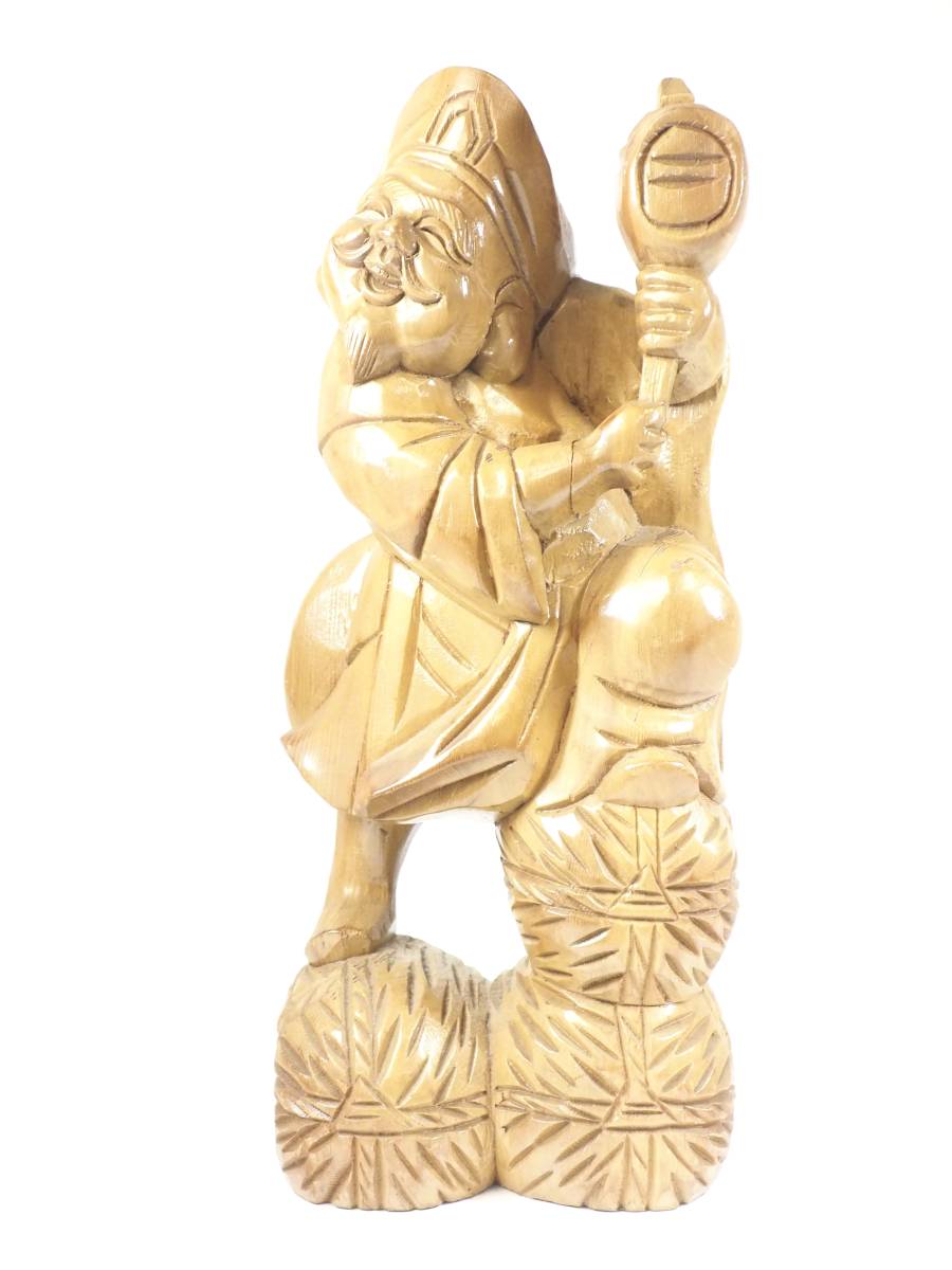 > 昭和ビンテージ 一刀彫大黒様 木彫り 縁起物 1970年代 幅19cm 奥行き12cm 高さ43cm 七福神の一人で、大黒様は豊作の神様。 YRT506