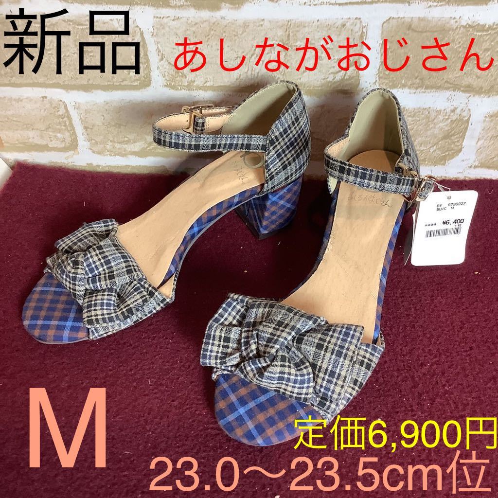 > 【売り切り!送料無料!】A-313 あしながおじさん!アンクルストラップサンダル!M 23.0〜23.5cm位!チェック!柄物!ブルー!紺色!太めヒール!新品