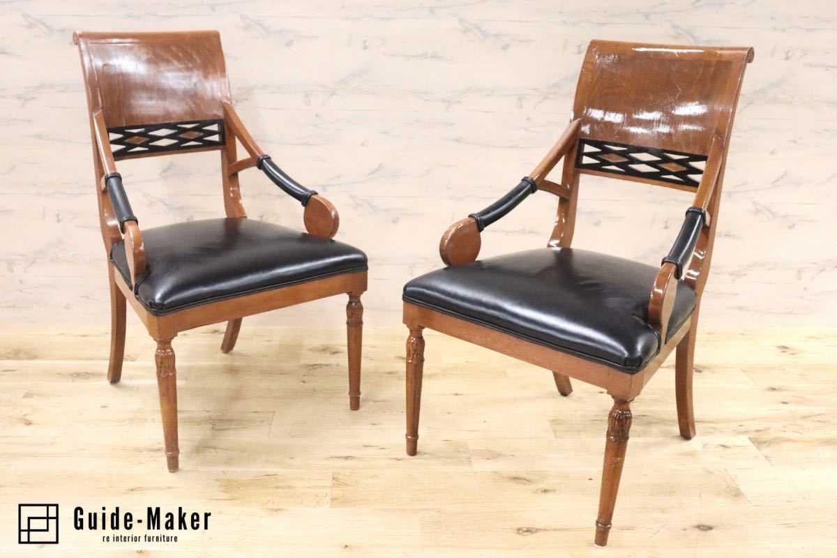 > GMGN142G○イタリア製 クラシック モダン ダイニングチェア 椅子 2脚セット セミアームチェア 本革 レザー 西洋 アール・ヌーヴォー