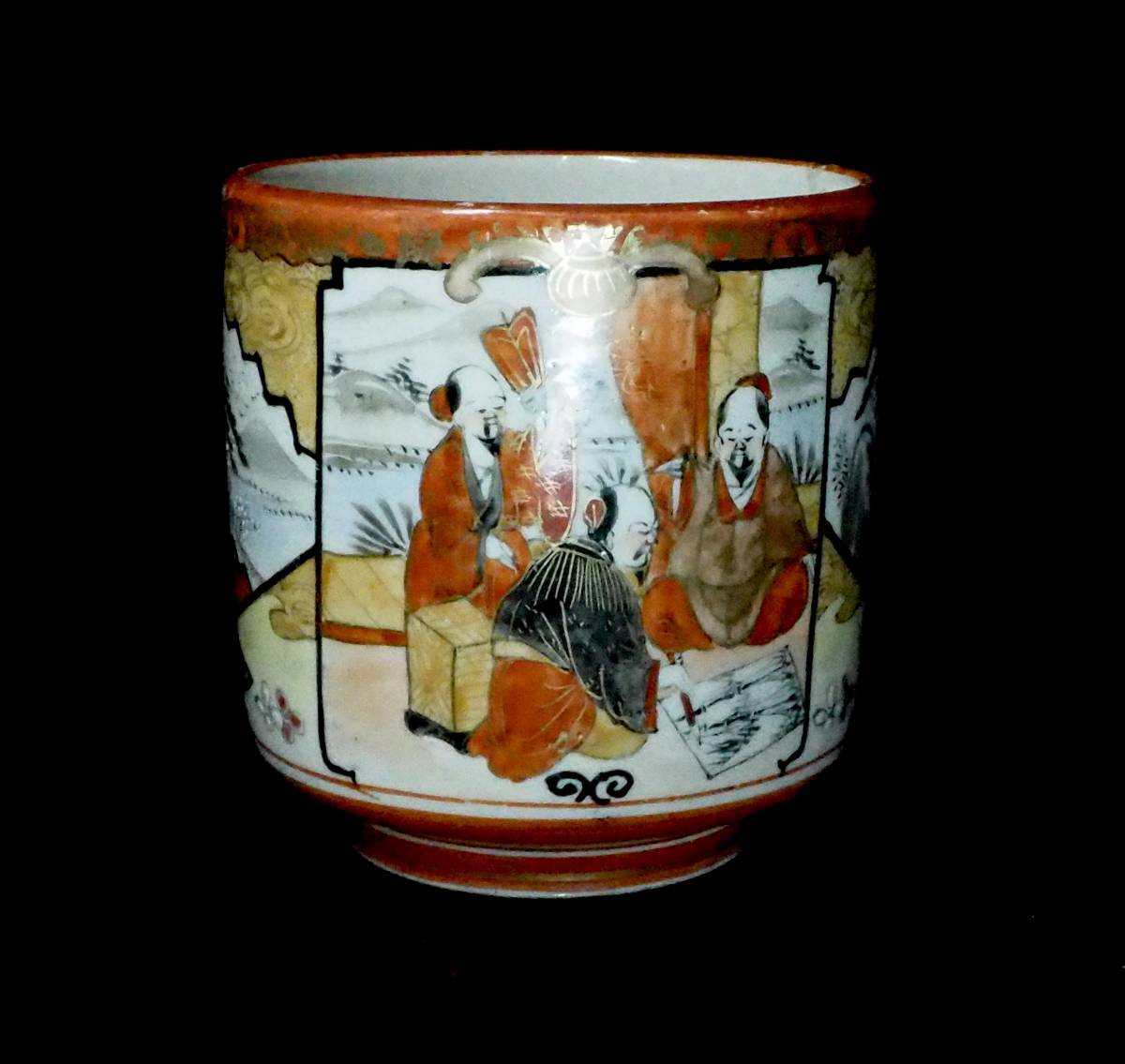 - 明治〜大正期 古九谷 本金彩 手描き 赤絵金彩楼閣人物文様窓絵 湯呑み 漢詩「代白頭吟」深い味わいが魅力的!直径7cm 高さ7.5cm ZZZ507