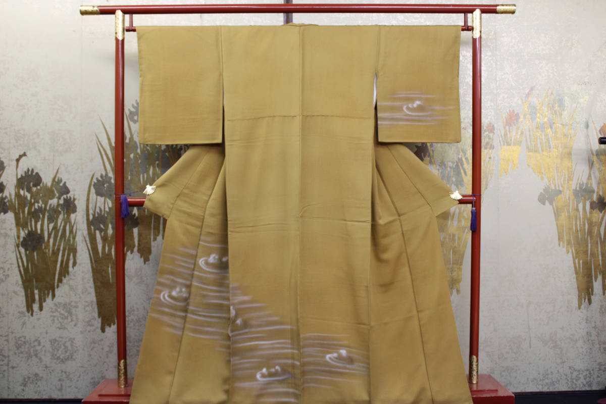 > きもの今昔5372 付け下げ訪問着 広衿袷仕立て 正絹紋意匠生地手描き石庭の柄 からし色柄部霞ボカシ 身丈160cm