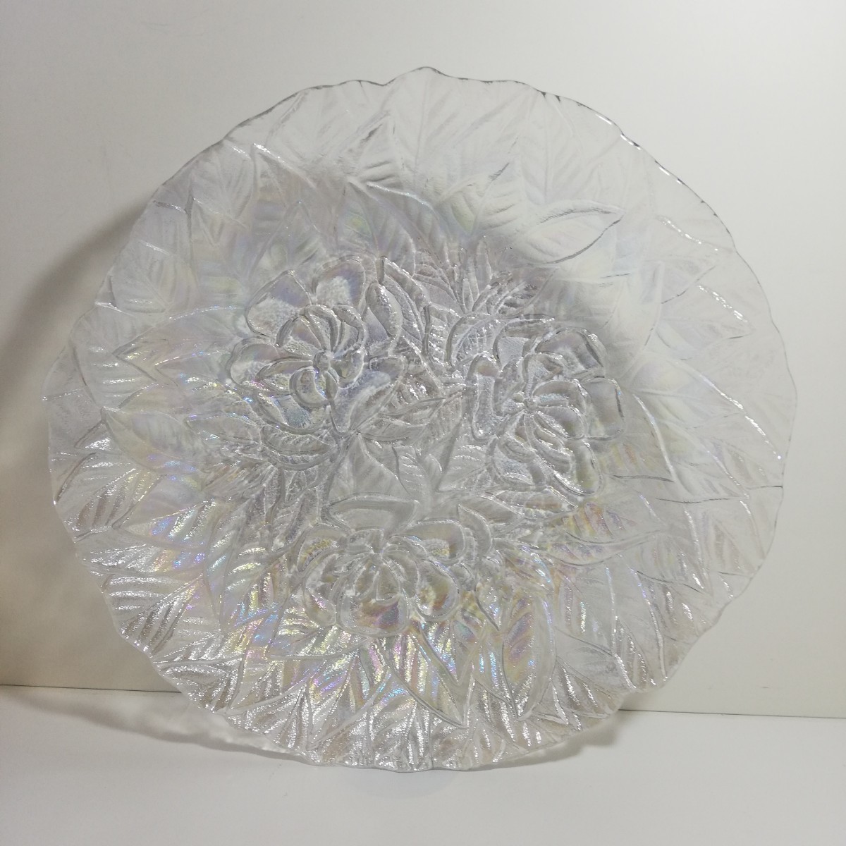 > 佐々木硝子 オーロラ加工 裏陽刻 花柄 ガラス大皿 盛皿 直径33cm×31.7cm×高さ6cm [昭和レトロ ビンテージ ガラス皿 ]