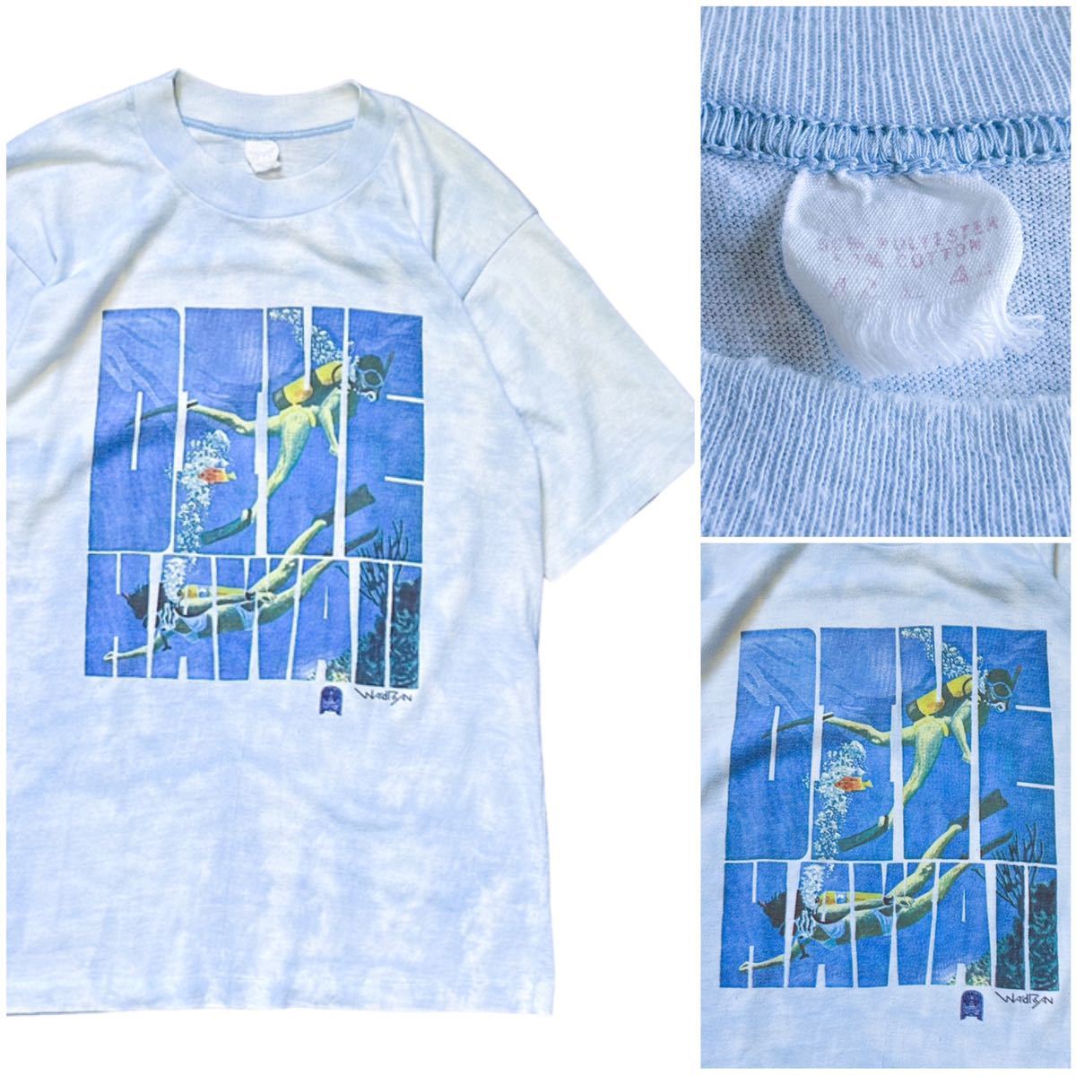 > 70’s ヴィンテージ Tシャツ タイダイ ブルー 青 水色 Lサイズ ハワイ DIVE HAWAII アート プリント フォトプリント 両面 シングルステッチ