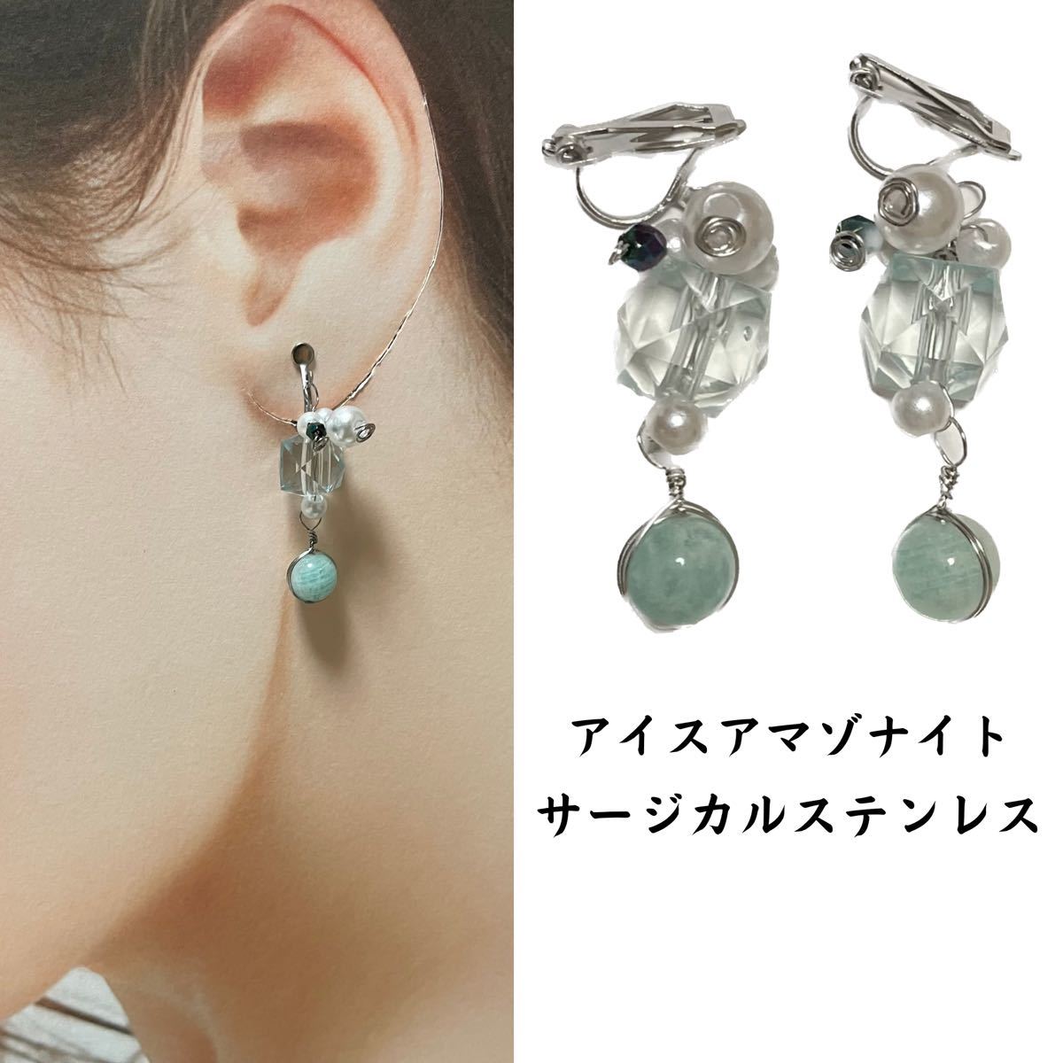 > イ58. 天然石 イヤリング アイスアマゾナイト ハンドメイド アマゾナイト サージカルステンレス アレルギーフリー ニッケルフリー