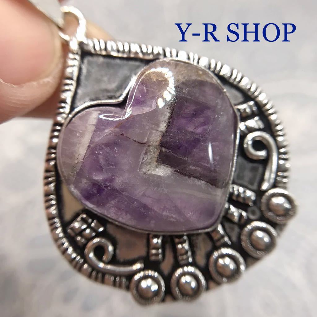- 天然石★ハート型アメジストのアンティーク調ペンダントトップ ★レディースネックレスシルバー925刻印エスニックインドジュエリー新品Y-R