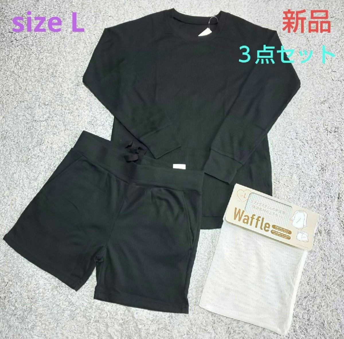 - ワッフル生地 ルームウェア ブラック色 Lsize【新品・タグ付き】
