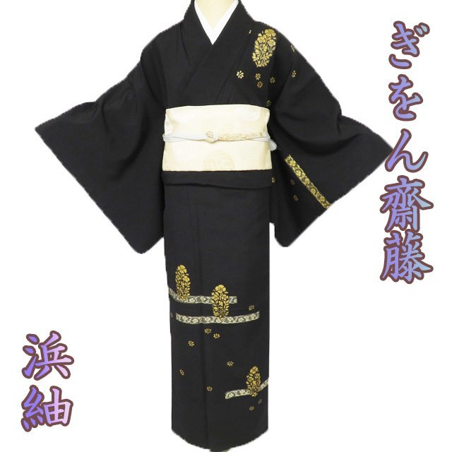 > 特選 訪問着 着物 中古 正絹 浜紬 袷 ぎをん斎藤 花の図 金彩 たとう紙付き 黒色 金銀 身丈161.5cm 裄66.5cm M きもの北條 A908-9