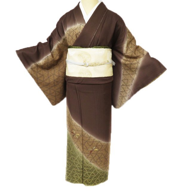 > 訪問着 着物 未使用 正絹 袷 フォーマル ますいわ屋扱い ぼかし染め 暈し 焦茶色 薄茶色 身丈164cm 裄66.5cm L きもの北條 A910-11