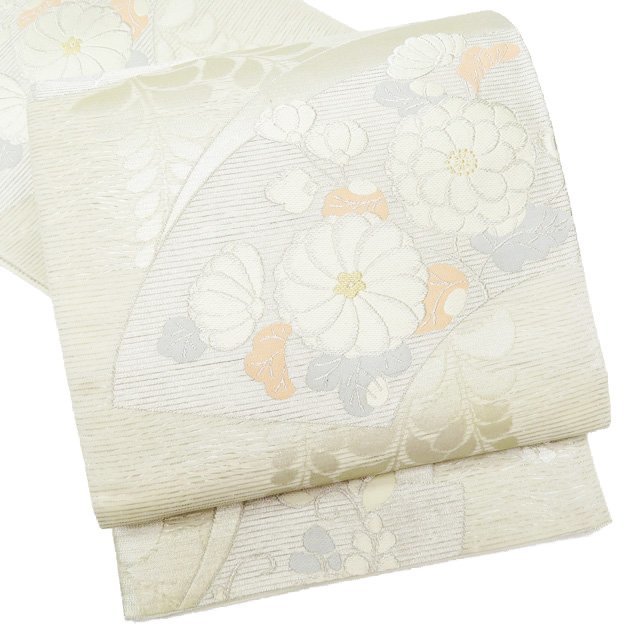 - 夏物 袋帯 中古 リサイクル 正絹 フォーマル 未仕立て 六通 地紙に花の図 灰白色 多色 金銀 きもの北條 A915-10