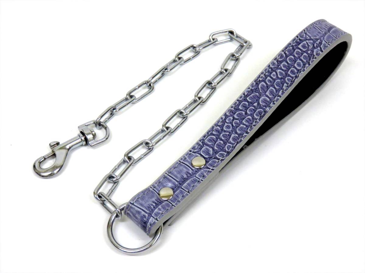 > 銀 犬用 チェーンリード 全長 65cm 持ち手幅 2.5cm チェーン幅 1cm シルバー クロコ型押し PUレザー チェーン ペット用 散歩 新品 送料無料