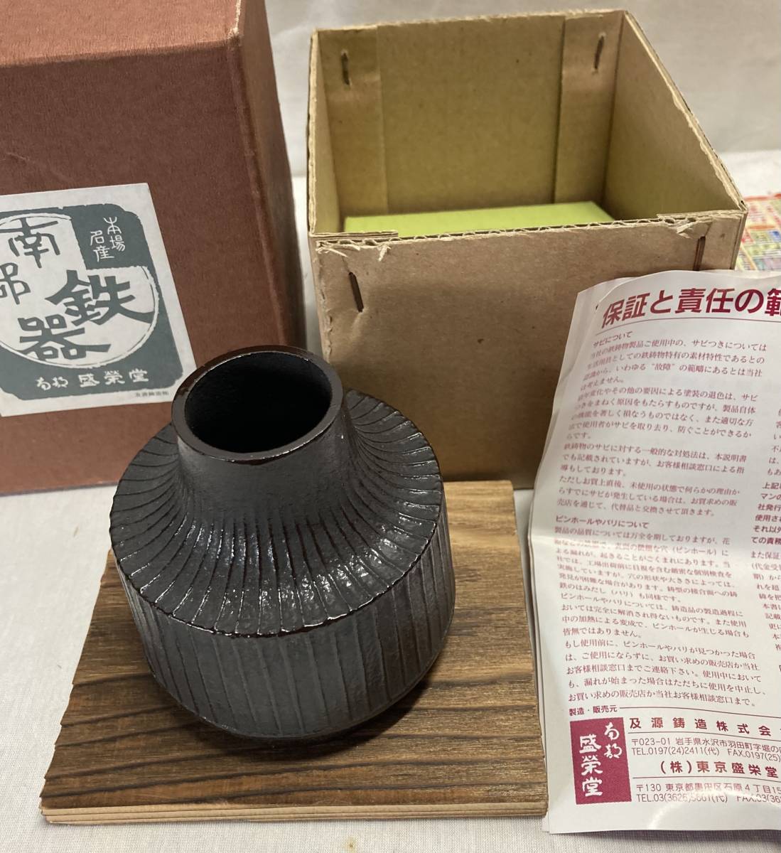 - 珍品:未使用 南部鉄器 盛栄堂 一輪差千筋 花瓶と台座 元箱入り 1126