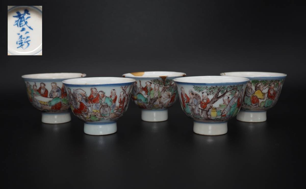- 江戸期 初代真清水蔵六 色絵人物図 煎茶碗 5客 箱付