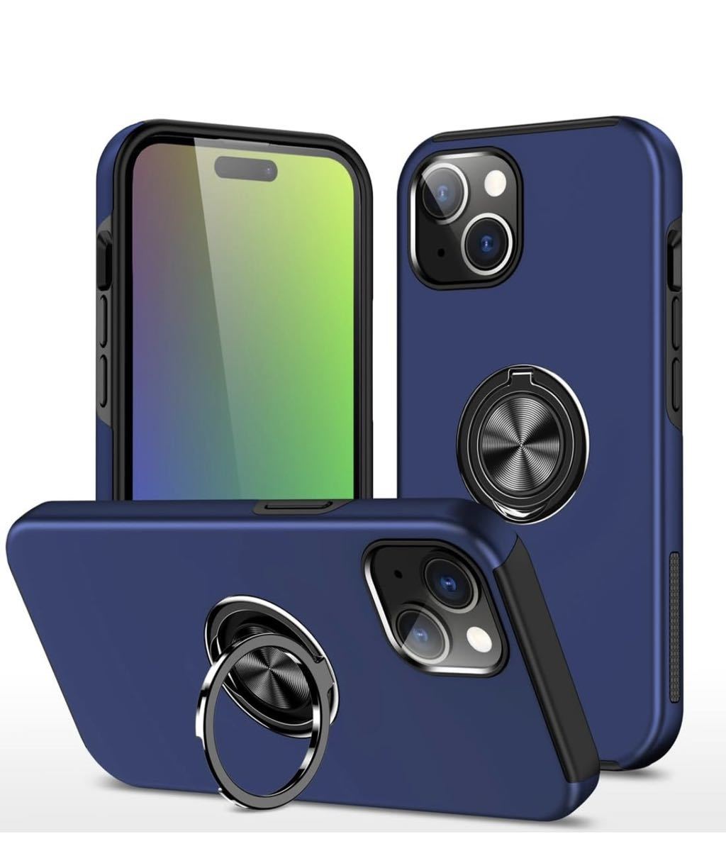 - Phone 15 用 ケース リング付き 耐衝撃 TPU 二重構造 アイフォン15 カバー リング スタンド機能 車載ホルダー対応 ネイビー色 セール