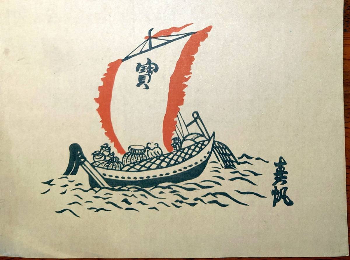 - f23100559〇木版画 宝船 七福神が乗る帆船 新年をあらわす季語〇和本古書古文書