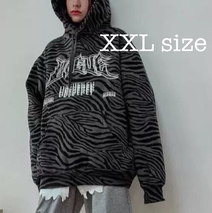 > パーカー ビッグシルエット トップス フード ゼブラ柄 長袖 オーバーサイズ プルオーバー アニマル柄 メンズ レディース 男女兼用 黒 XXL