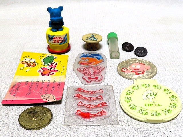 - レトロ小物 玩具いろいろ ロゼットミラーコンパクト 白子さん ウメ星デンカ カルピスコルク栓 仮面ライダー のらくろクンスタンプなど