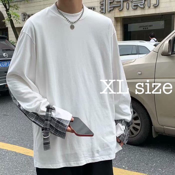 - ロングTシャツ チェック トップス ロンT ビッグシルエット ユニセックス 男女兼用 白 ホワイト XL