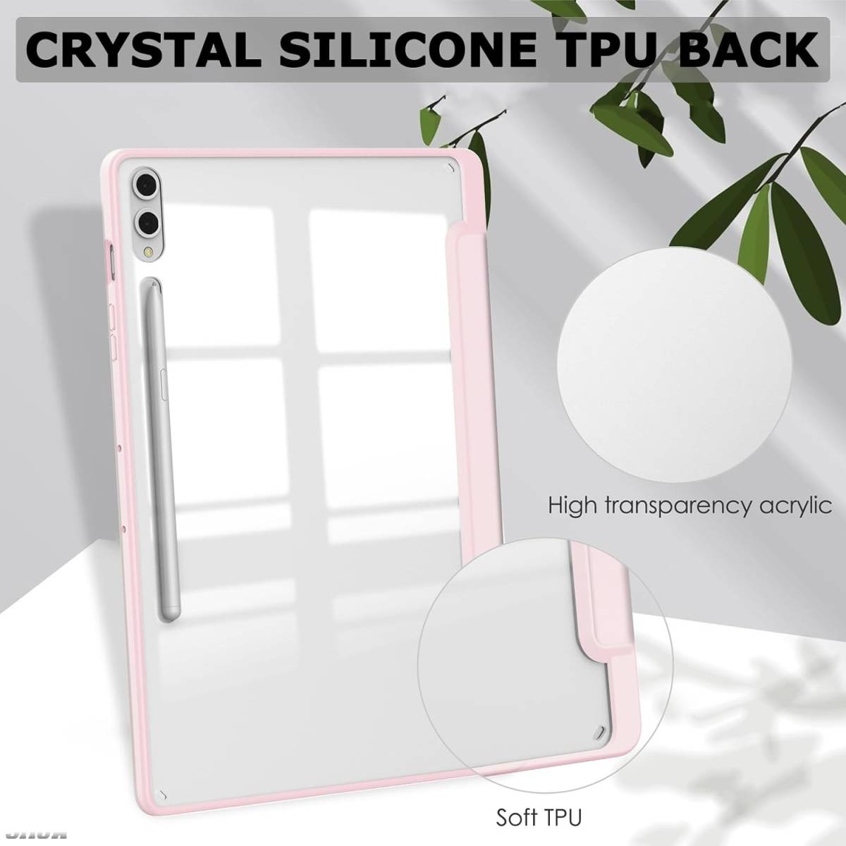 - ピンク 背面クリア 高品質 TPU + PUレザー 軽量 カメラ保護 オートスリープ / ウェイク Galaxy Tab S9 FE ソフト ケース カバー