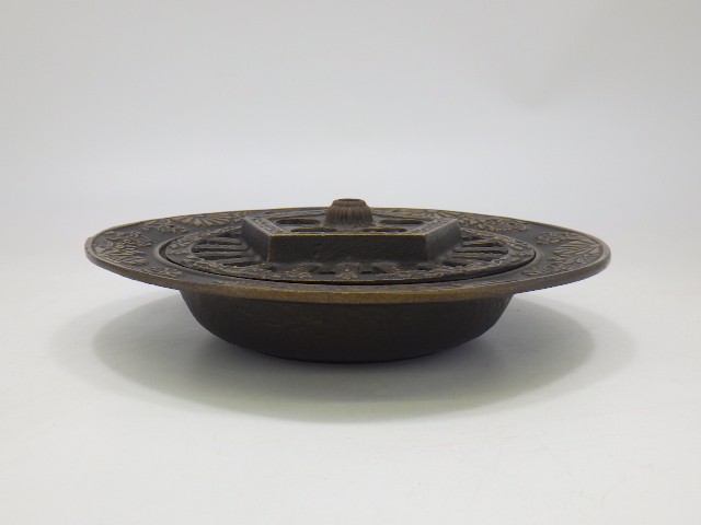 - h4L031Z- 昭和レトロ 万右エ門 金彩源氏車 菊文 鉄製 灰皿 蓋付き