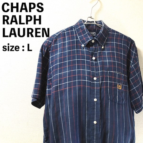 - CHAPS RALPH LAUREN チャップス ラルフローレン ワンポイント刺繍ロゴ 半袖 リネンシャツ L 紺 ネイビー ワークシャツ チェック ストライプ