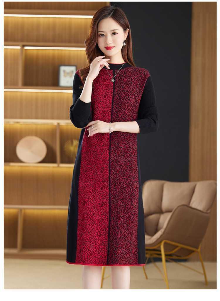 - 【レッド&ブラック色★Lサイズ】長袖 ひざ丈 ニットワンピースおしゃれ
