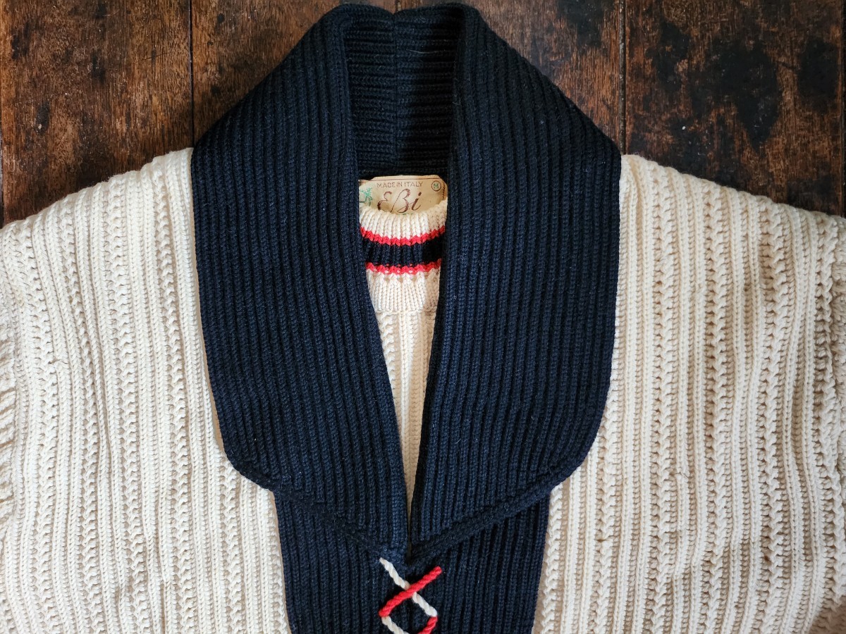 - レア ★ ビンテージ ショール カラー ウール ニット セーター ホワイト ネイビー リブ ボーダー レースアップ イタリア スウェット シャツ