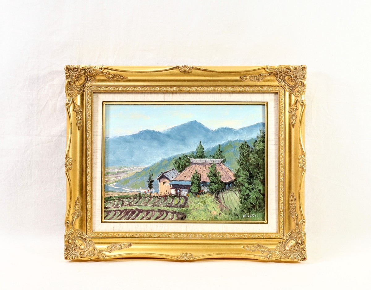 - 真作 碓氷桂三 油彩「伊那風景」画寸 F4 兵庫県出身 日洋会所属 長野県南部、中川村の美里地区にただ一軒残る茅葺きの家 日本の原風景 8230