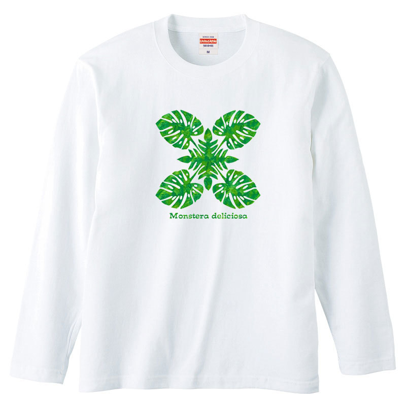 > レディースL対応(タグ表記M)/ホワイト【tl043】*インパクト四葉モンステラ* 男女兼用/長袖/Tシャツ/フラダンス/ハワイアン/送料無料