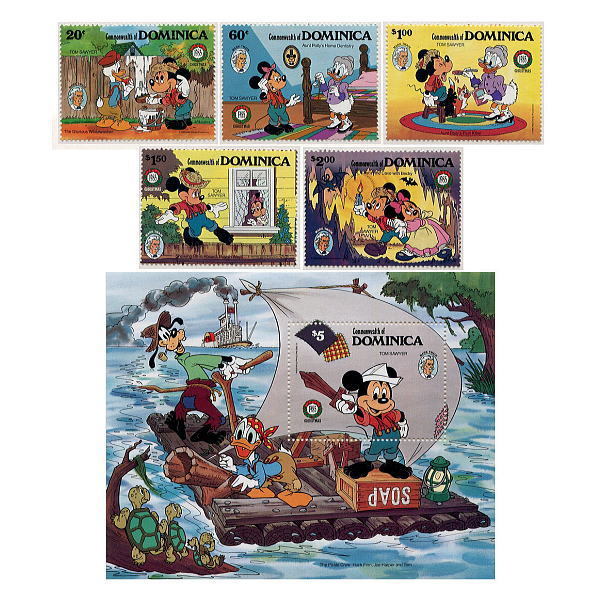 > ディズニー ミッキー ドナルド 切手/小型シート1枚&切手5枚(マーク・トウェイン生誕150年) 発行国Dominica 1985年発行 新品