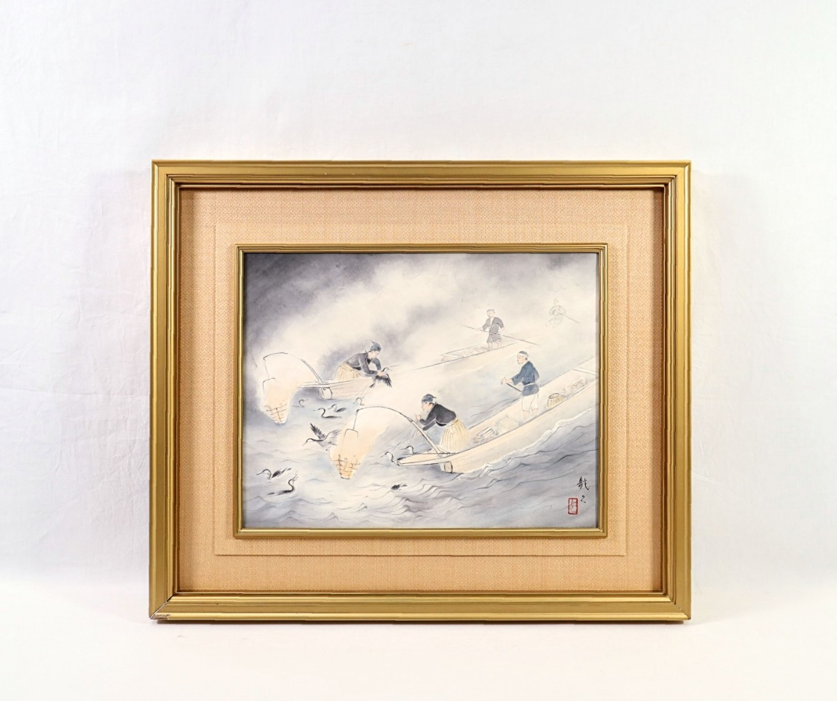 > 真作 森龍久 水墨「鵜飼」画寸 6号 岐阜県、吉野画廊創設者 清交会設立 東京美術倶楽部鑑定委員 鵜匠の巧みな網さばきと鵜の妙技 8351