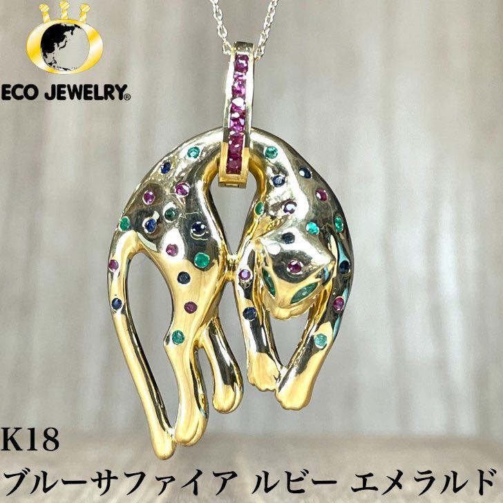 - K18 ルビー サファイア エメラルド ヒョウ 豹 パンサー ペンダントトップ 11.02g M1605