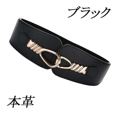 - 【本革 幅広 ゴムベルト】【ブラック】レディース ゴールド バックル 金
