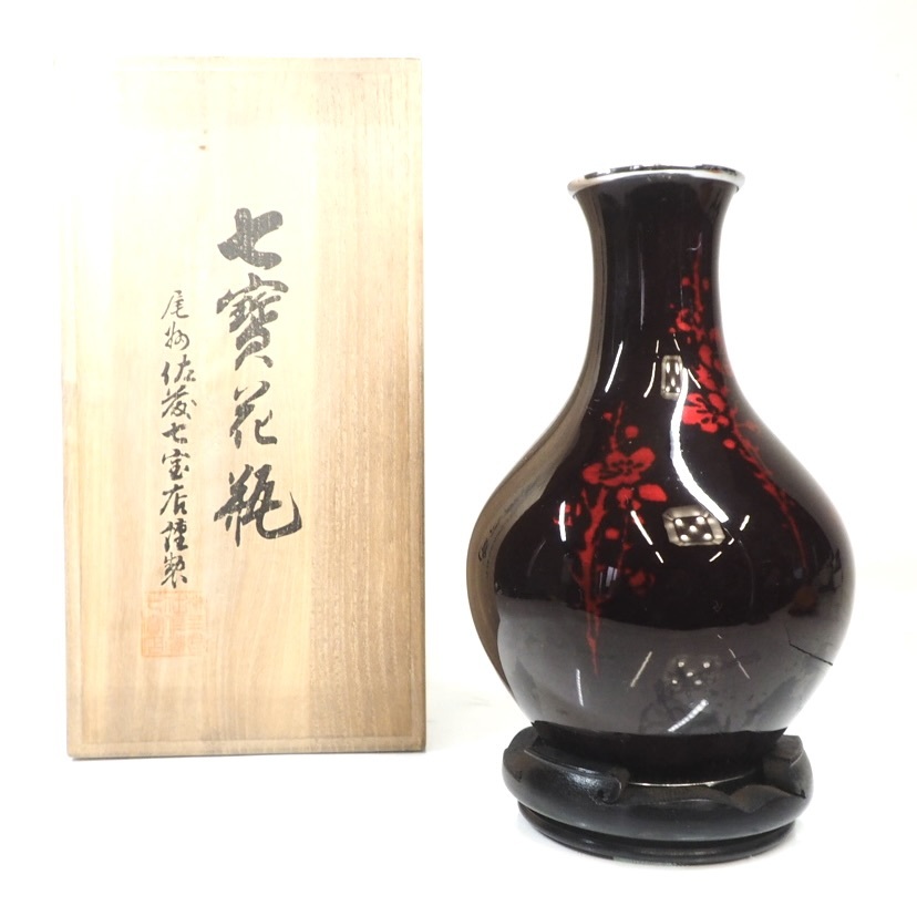 - 昭和ビンテージ 無線七宝 七宝焼 6号首長梅の木紋花瓶 タメ色 株式会社 佐藤七宝店 謹製 花器 飾壷 丸木台・共箱付き 1970年代 KEN512
